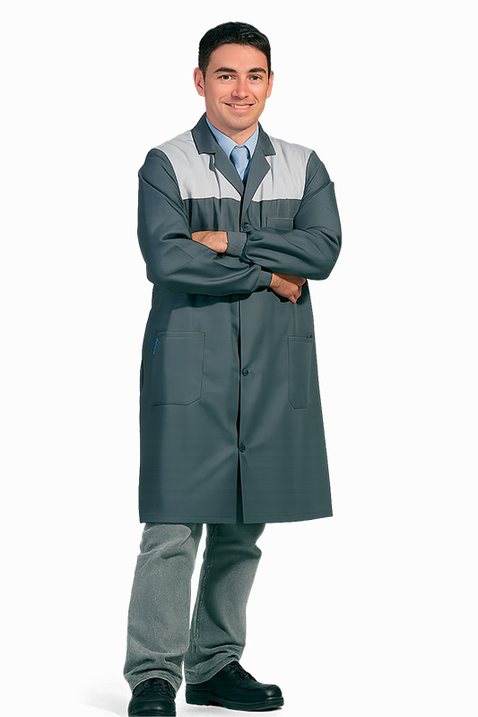 Bata: Bata recta con pinza, cierre frontal con botones o velcro; canesú en pecho y espalda a color combinado; 1 bolsillo pecho de parche 6 2 a la altura de la cadera.